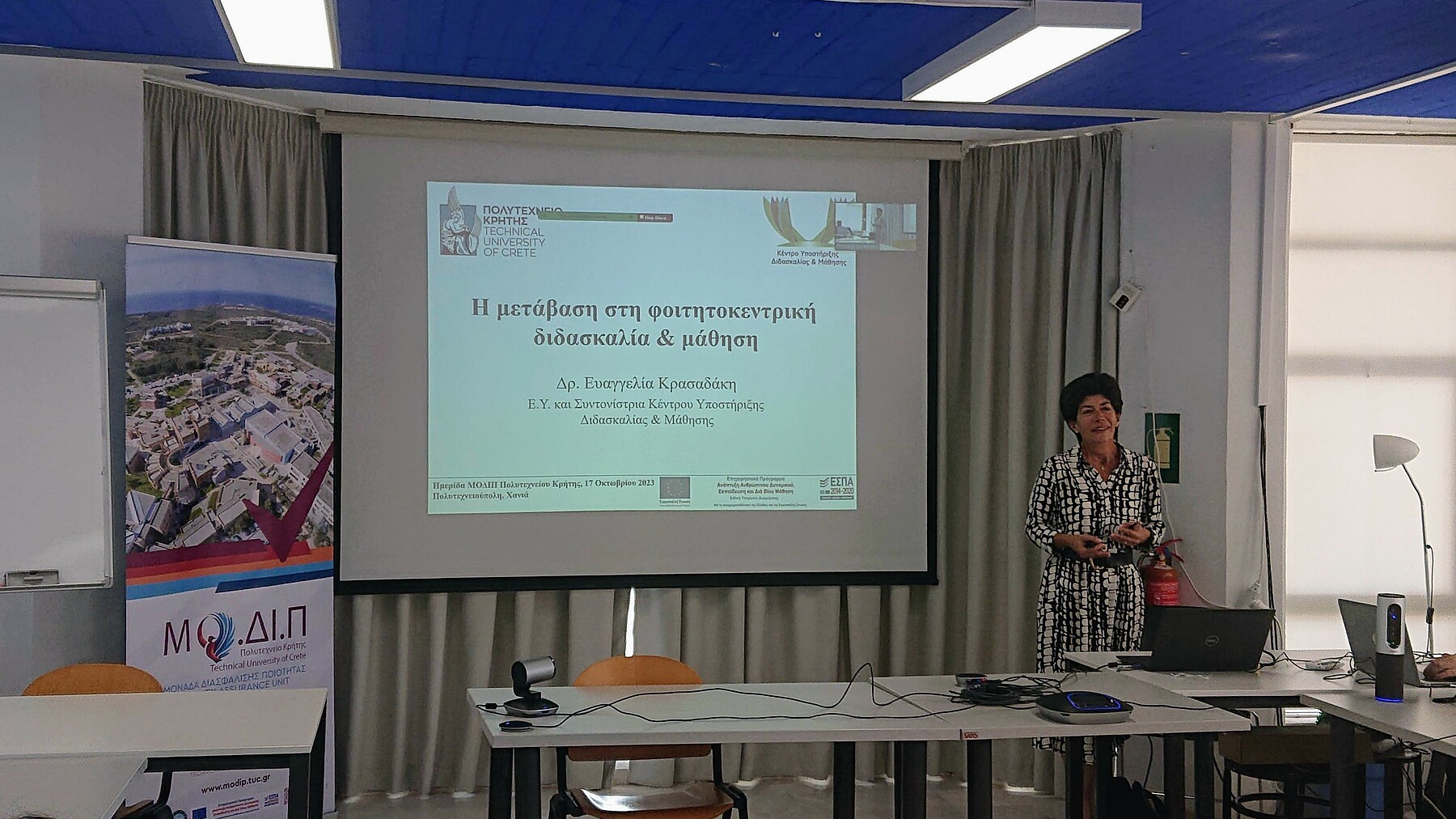 Τέλος, η ημερίδα ολοκληρώθηκε με την παρουσίαση «Η μετάβαση στη Φοιτητοκεντρική Διδασκαλία και Μάθηση» από την Δρ. Ευαγγελία Κρασαδάκη, μέλος ΕΔΙΠ της Σχολής ΜΠΔ και Επιστημονικά Υπεύθυνης του Κέντρου Υποστήριξης Διδασκαλίας και Μάθησης (ΚΕΔΙΜΑ) του ΠΚ.